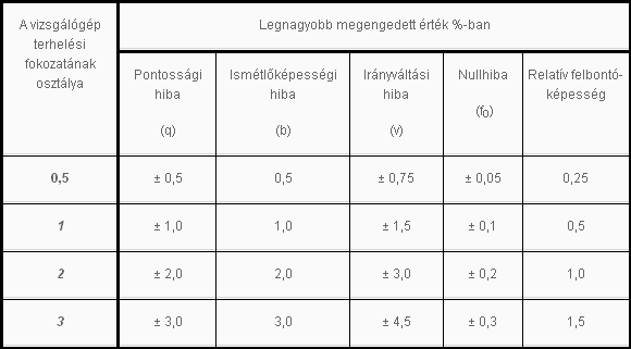 A vizsgálógépek a szabványba foglalt követelmények alapján az alábbi pontossági osztályokba sorolhatóak: