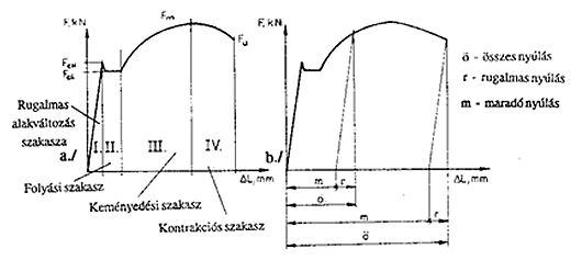 A szakítódiagramokból, illetve a próbatestek vizsgálat előtti és utáni méreteiből számíthatók az alábbi jellemzők: